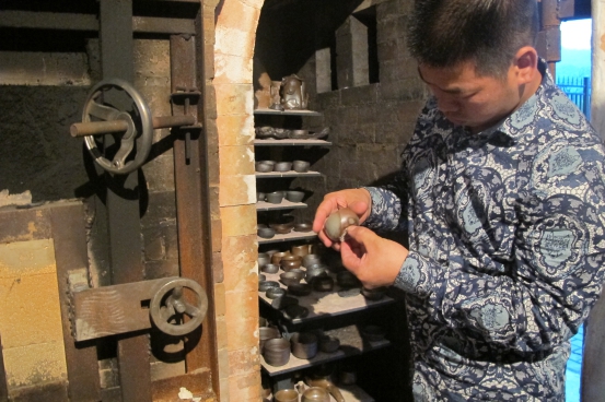 据了解,柴窑在烧制时,里面的最高温度能达到一千三百多度,开窑时尽管冷却了不少,但窑内的温度还是有一百三十多度。容纳了老师和同学们共三百余件作品的柴窑,需要同学们探进身去,从高温中一件件把陶器用手拿出来,并且越往后往下,温度越高,在这个还吹着凉风的季节里,负责搬运的同学频频的擦着头上的汗,不一会儿衣衫就被汗浸湿了。