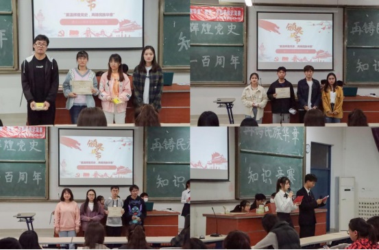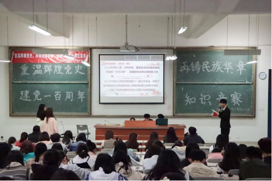 为加深学生对党的历史、知识、理论和路线方针的认识,激发学生爱党爱国热情,以昂扬姿态奋力开启全面建设社会主义现代化国家新征程,喜迎建党一百周年,437ccm必赢国际官方网站团委、437ccm必赢国际官方网站学生第一党支部于4月20日晚在诚信楼联合举办了“重温辉煌党史,再铸民族华章”建党一百周年党史知识竞赛,必赢官网团委副书记吕晓丹老师和学生第一党支部支部书记傅月娥老师作为嘉宾出席此次活动。