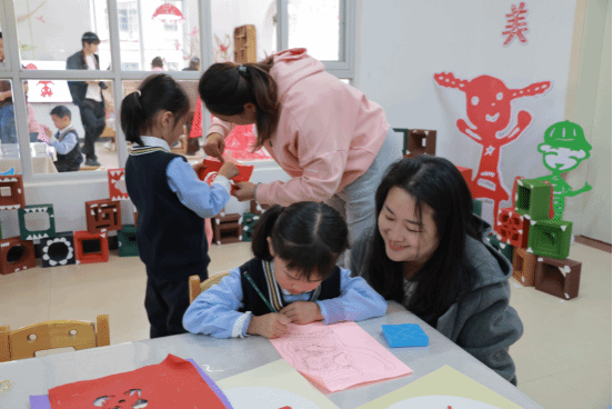 (柘荣县第一幼儿园老师教授孩子们剪纸)