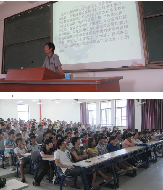 随后,叶林心主任从系部实际情况出发,将教学设施、师资力量,历年来获得的成绩,以及潘渡新校区未来美术系的规划作了详尽的介绍。第一,介绍了雄厚的师资队伍,其中不乏各个专业领域的带头人和客座教授。第二,介绍了各专业在全省乃至全国比赛中的获奖情况,鼓舞了同学们对专业的自信和加深了商业美术系的热爱。特别是动漫专业、服装专业在省级国家级比赛获得成绩。第三,我系各专业每门课程结束后,收集立体构成、建筑速写、色彩写生、素描写生、平面构成等方面的优秀的作品,在校园广场举办优秀艺术作品展。并重点展示在三坊七巷举办的13届毕业生作品展。加强了同学们对艺术作品的了解,提高了对美术作品的鉴赏能力,促进了校园的繁荣和发展。同时也进一步丰富我们的校园文化建设。叶主任从美术系未来规划和新校区美术楼及艺术展厅的建设,和同学们畅想了美术系的发展方向,并对同学们在大学期间的学习和成长寄以了厚望。